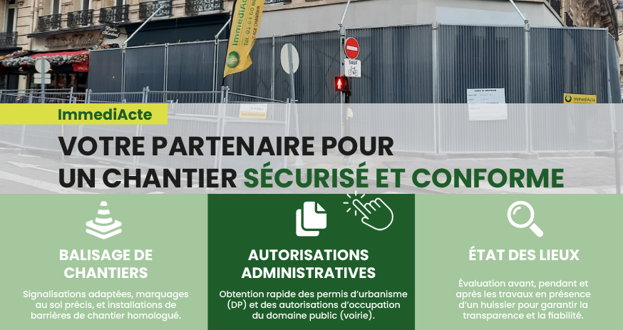 La sécurité des chantiers est essentielle. Avec des services adaptés comme les barrières de chantier, la signalisation et le balisage, Immediacte vous aide à protéger vos équipes et les passants tout en respectant les normes.